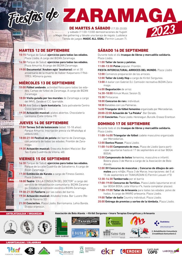 Desde el martes 12 al domingo 17 celebraremos las fiestas de Zaramaga, nuestro barrio, en el que un gran número de personas, entidades y comercios se han volcado y colaborado. En total serán más de 40 actividades para todas las edades y gustos. Todas estas actividades tendrán lugar en diferentes escenarios, con la Plaza Llodio como lugar que reunirá mayor actividad.
