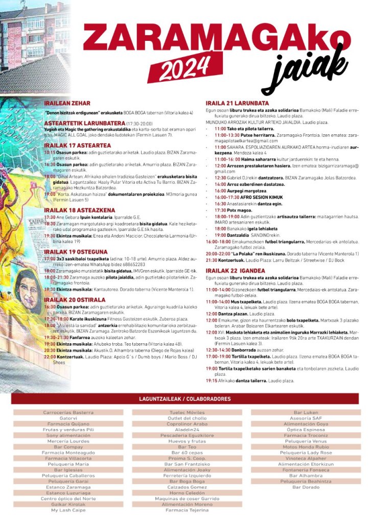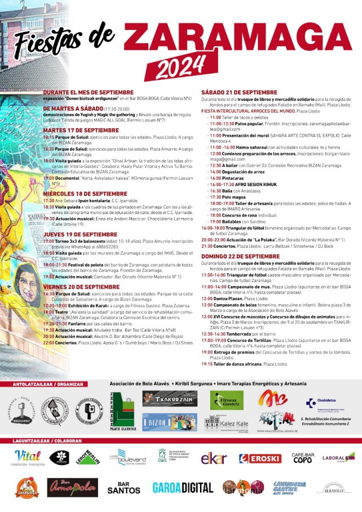 ¡Las fiestas de Zaramaga 2024 están de vuelta! Nuestro barrio las celebrará entre los próximos martes 17 y domingo 22 de septiembre, con una programación dirigida a todos los públicos. Serán un total de 45 actividades llevadas a cabo por diferentes colectivos de Zaramaga y que tendrán lugar en diferentes escenarios, siendo la Plaza Llodio el punto neurálgico en el que se situarán el escenario y la txosna durante el fin de semana.