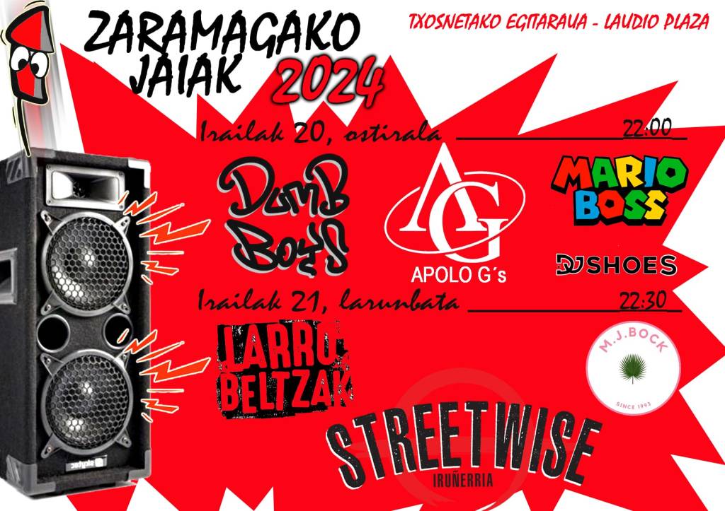 Habrá conciertos en diferentes bares de Zaramaga entre el miércoles y el viernes: Chocolatería Larmonía, Bar Dorado, Bar Teo y Bar Alhambra, además de los conciertos que tendrán lugar en el txosnagune de la Plaza Llodio.
